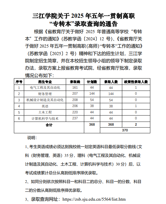 三江学院关于 2025 年五年一贯制高职 “专转本”录取查询的通告 根据《省教育厅关于做好 2025 年普通高等学校“专转 本”工作的通知》(苏教学函〔2024〕12 号)、《省教育厅关 于做好 2025 年五年一贯制高职(高师)“专转本”工作的通知》 (苏教学函〔2025〕2 号)精神和下达的招生计划,三江学 院制定招生简章,并在本校招生领导小组的领导下制定录取 办法,录取方案上报省教育考试院,经省教育厅批准,录取 情况公布如下: